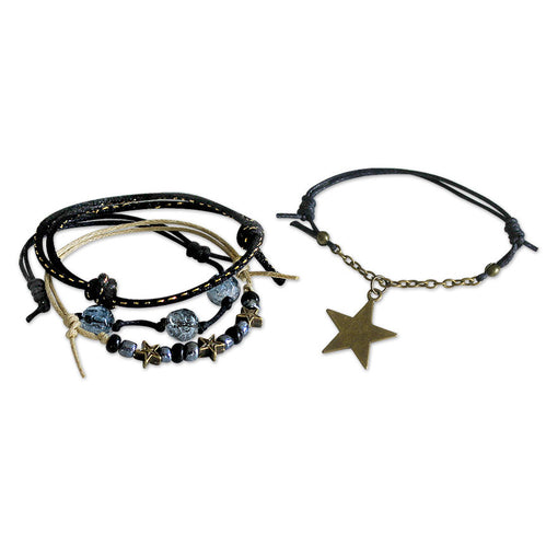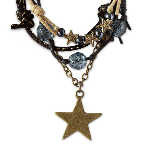 Shimmer with the celestial charm of the Star Gaze Bracelet! Midnight blue crackle beads, bronze star charms and iridescent glass beads hang from cords and a chain. Perfect for mixing textures, stac...