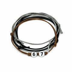 - Color: Black, gray & white string bracelets with white “67” number beads