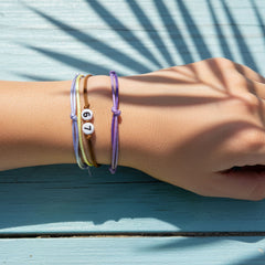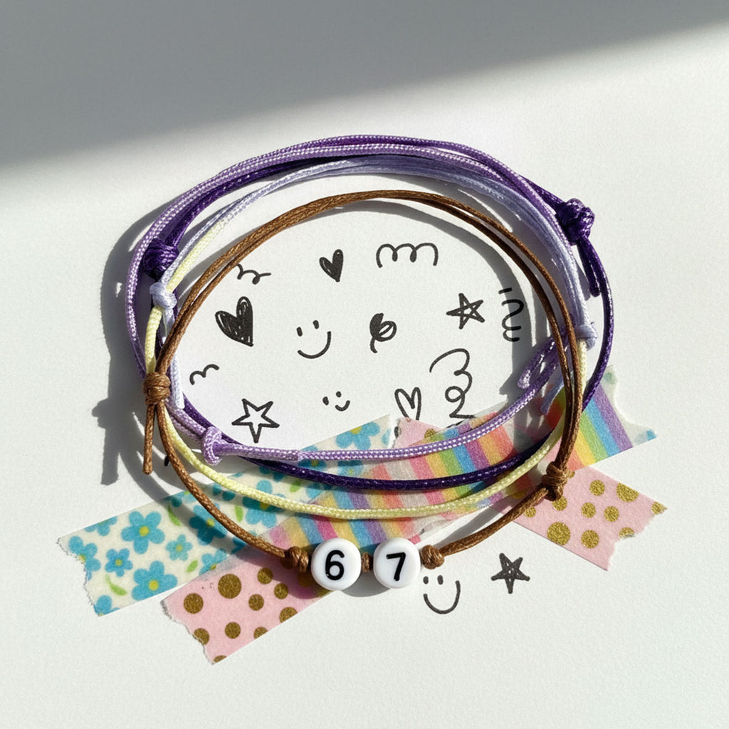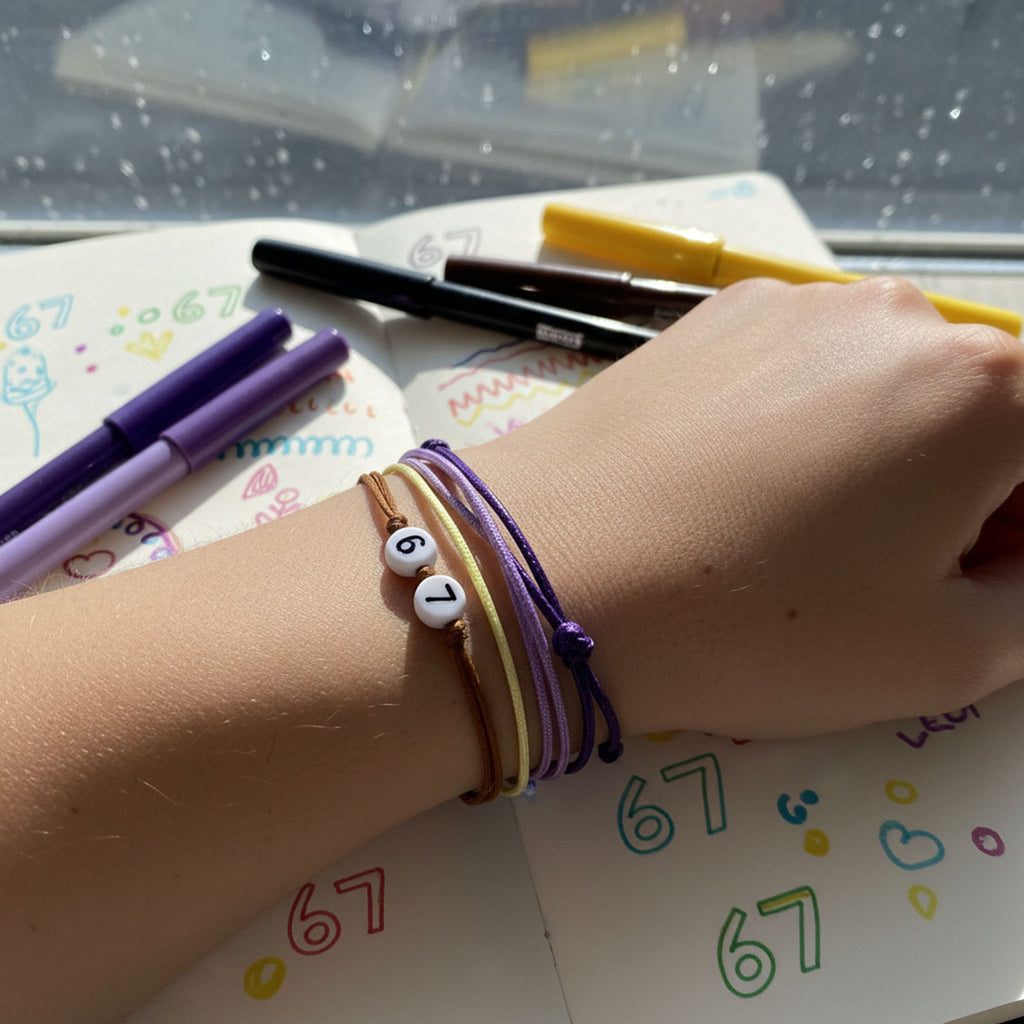 Each set includes four adjustable waterproof string bracelets in purple, lavender and ombré yellow with clean white “67” beads. Stack them for full drama or wear one for easy vibe energy — either way, you’re matching your mood effortlessly.