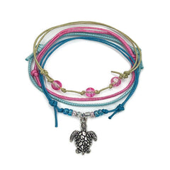 "This sea turtle style pack is amazing! The silver turtle charms and seafoam green cords are so beachy. Waterproof and perfect for stacking. Love the pink! O Yeah!"