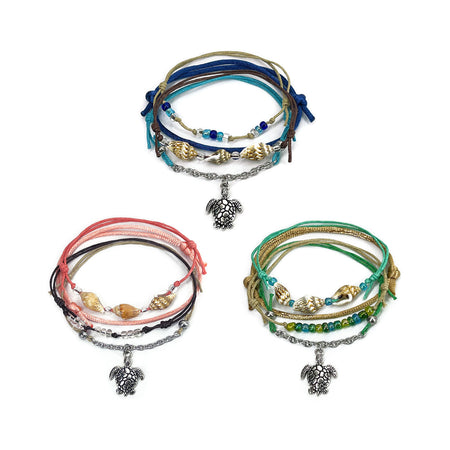 Turtle-ly tropical and ready to stack, this bracelet pack brings beach vibes with blue cords, sea turtle charms and natural coconut bead flair.