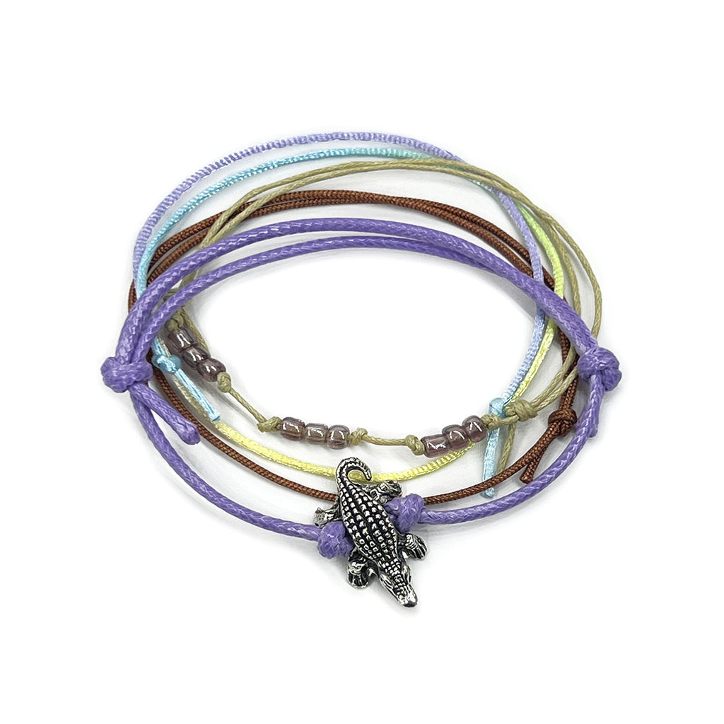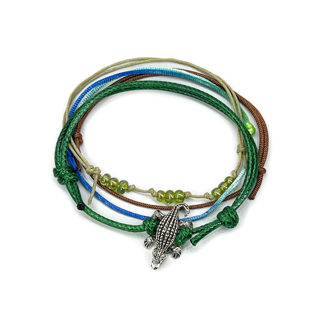 - Material: silver gator charm, cotton string, nylon cord, glass beads