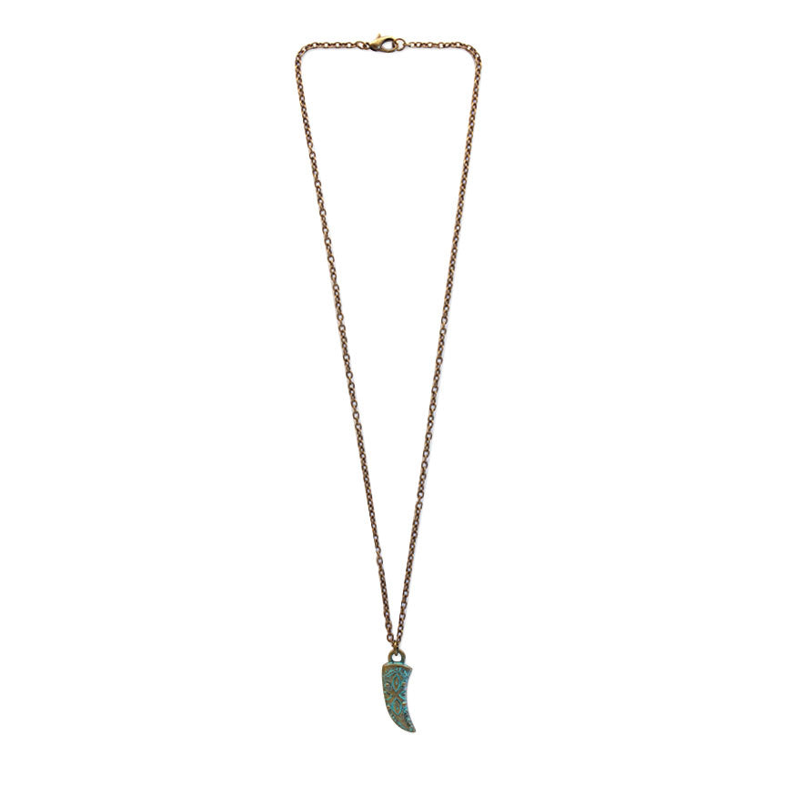 Pendant: Bronze-tone shark tooth charm with tribal-style detailing